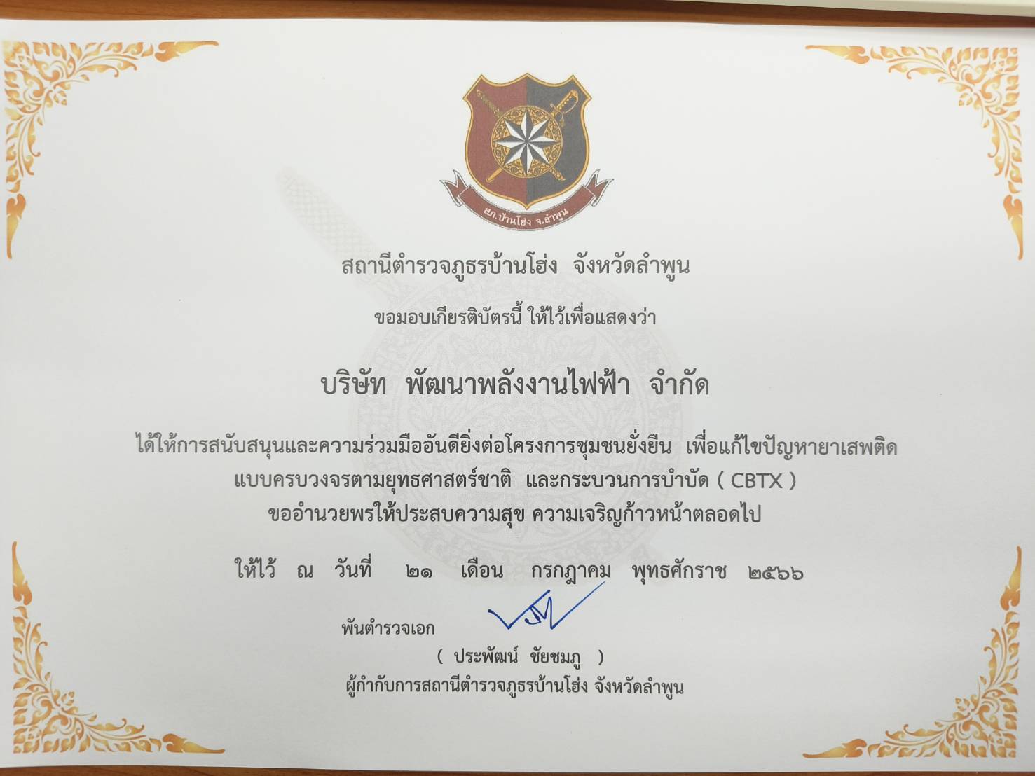 วันที่ 21 กรกฎาคม 2566 บริษัท พัฒนาพลังงานไฟฟ้า จำกัด โดย นายเจริญ เรืองทราย เจ้าหน้าที่ฝ่ายเทคนิค ได้เป็นตัวแทนของบริษัทฯ รับมอบเกียรติบัตรจากสถานีตำรวจภูธรบ้านโฮ่ง จังหวัดลำพูน ที่ได้ให้การสนับสนุนและความร่วมมืออย่างดียิ่งต่อโครงการชุมชนยั่งยืน เพื่อแก้ไขปัญหายาเสพติดแบบครบวงจรตามยุทธศาสตร์ชาติ และกระบวนการบำบัด (CBTX)